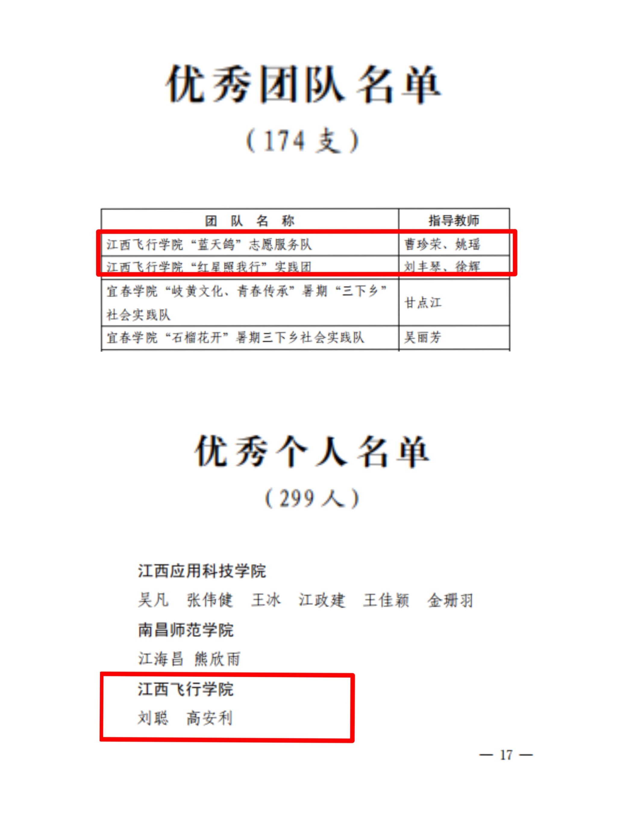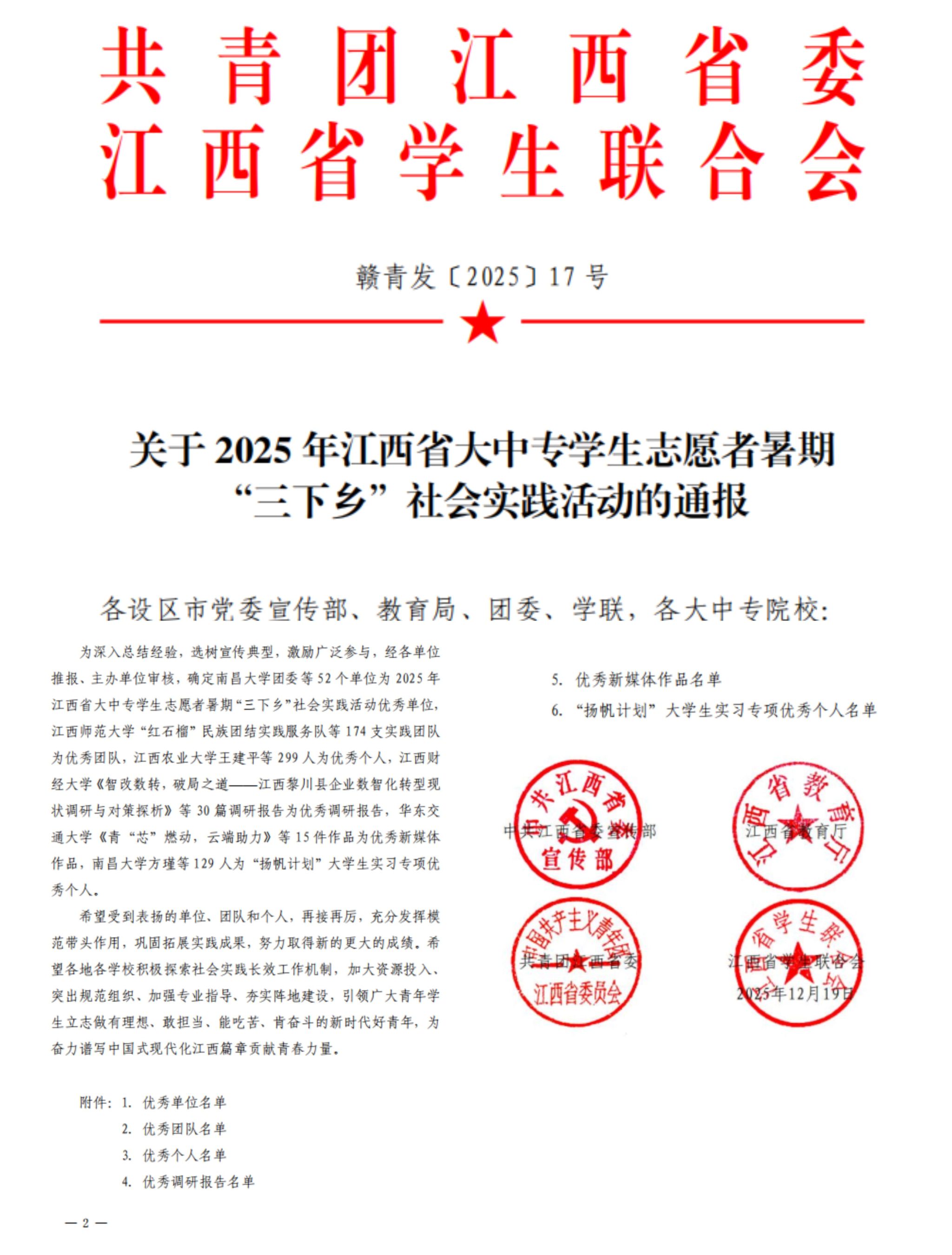近日,省委宣传部、省教育厅、团省委、省学联联合下发通知,对在2025年江西省大中专学生志愿者暑期“三下乡”社会实践活动中表现突出的团队、个人进行表彰,交通运输与工程学院“蓝天鸽”志愿服务队、文法学院“红星照我行”实践团荣获“优秀团队“称号,航空机电工程学院教师刘聪、飞行技术学院学生高安利荣获“优秀个人”称号。