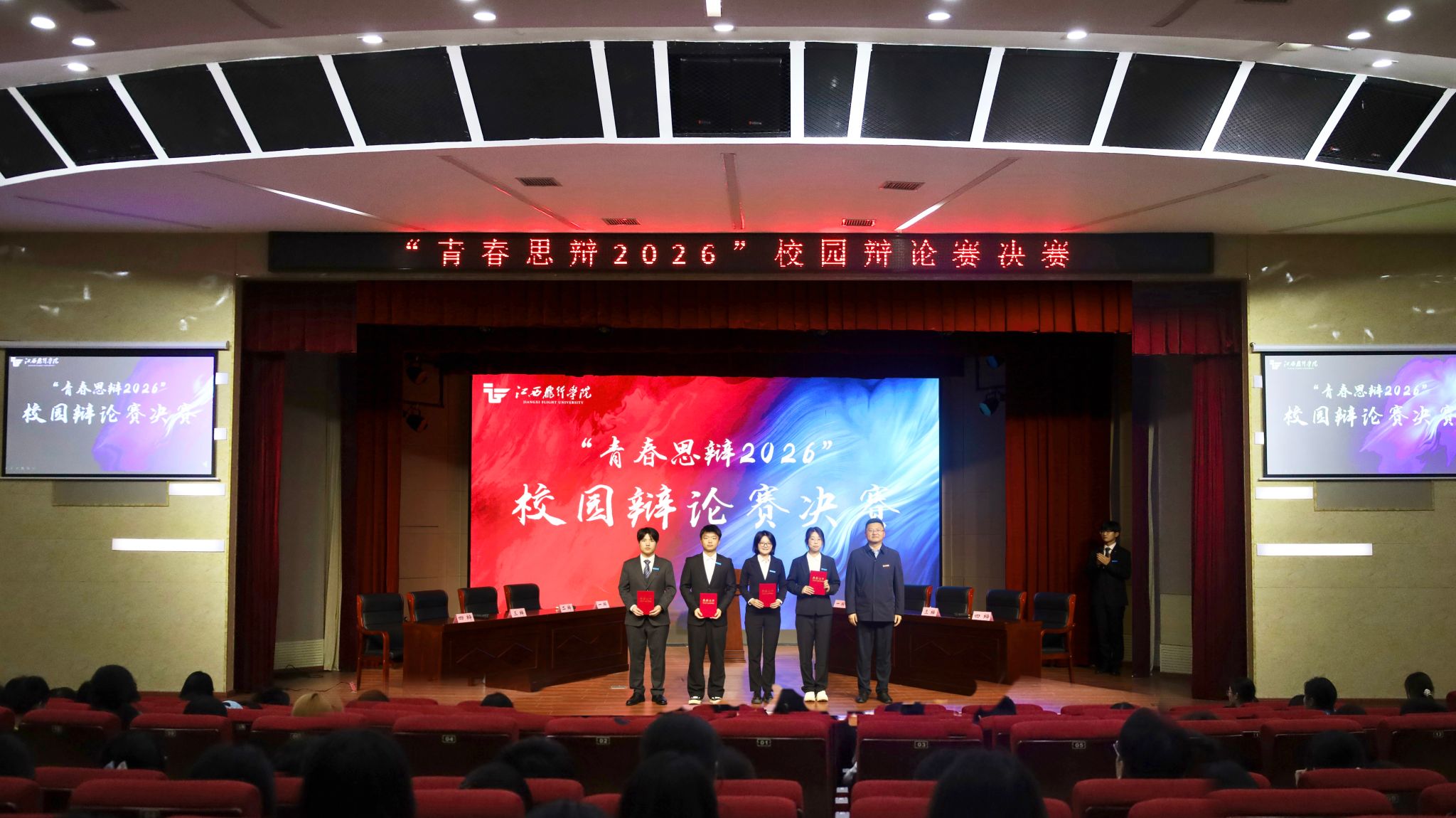 4月23日晚,学校“青春思辩2026”校园辩论赛决赛在航空大楼多功能报告厅顺利举行。本次决赛的评委由校团委书记陈磊、航空机电工程学院团总支书记徐佳铭和团委黄玲玲3位老师担任,共400余名学生代表观看比赛,四支学生队伍参与决赛。