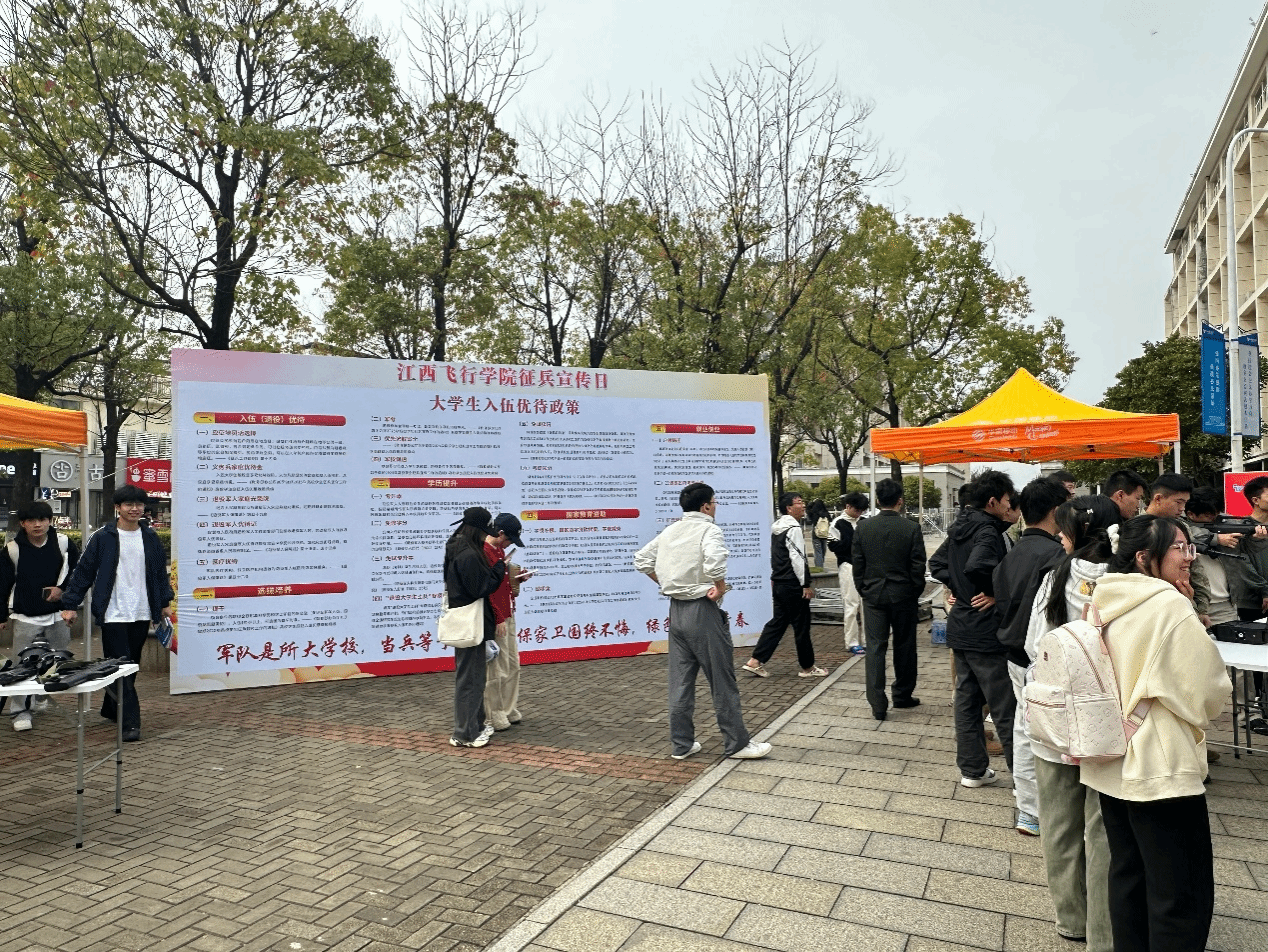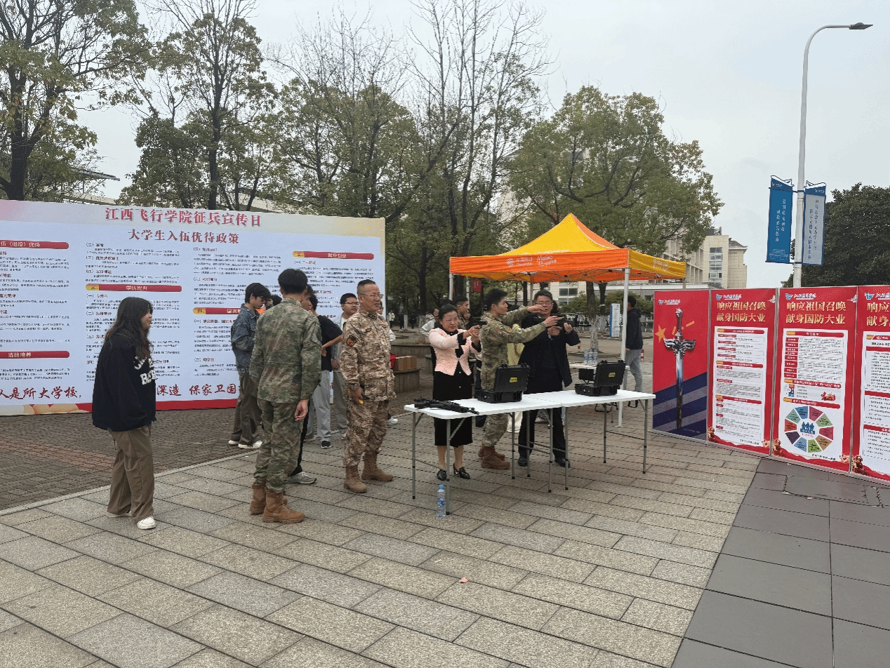 为进一步厚植大学生国防情怀、激发参军报国热情,11月4日,江西飞行学院爱国迷彩协会在食堂小树林举办了一场形式新颖的征兵宣传日活动。政策宣讲、军事装备体验等丰富环节有序开展,吸引众多学子驻足参与,校园内掀起“携笔从戎,逐梦军营”的青春热潮。